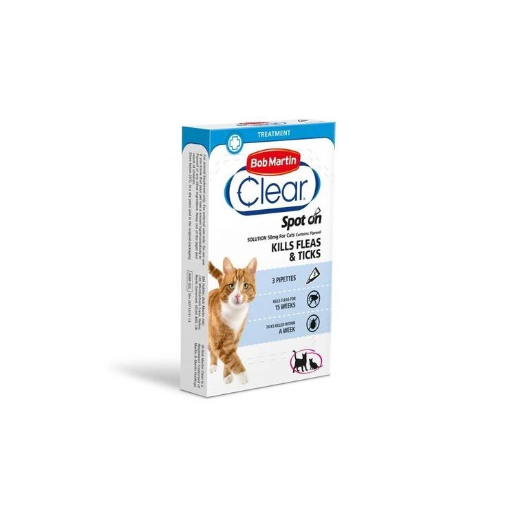 Bob Martin FleaClear Spot On Solution 50mg for cats is for killing fleas on your cat. It is applied at the back of the cat’s neck and between the shoulders. Each treatment provides protection against fleas for up to 5 weeks.
