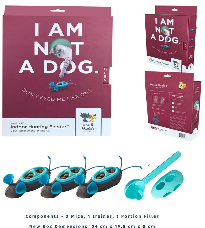 The Indoor Hunting Cat Feeder is a complete bowl replacement for one cat. Instead of filling the bowl twice a day, fill and hide the three (3) Doc & Phoebe Mice morning and night. Your cat will hunt, catch, and play with many small meals day and night, as nature intended. Decrease anxiety, reduce the instance of scarf and barf, end early wake up calls from a hungry cat, and correct your litter box woes by hiding these easy and fun feeders.