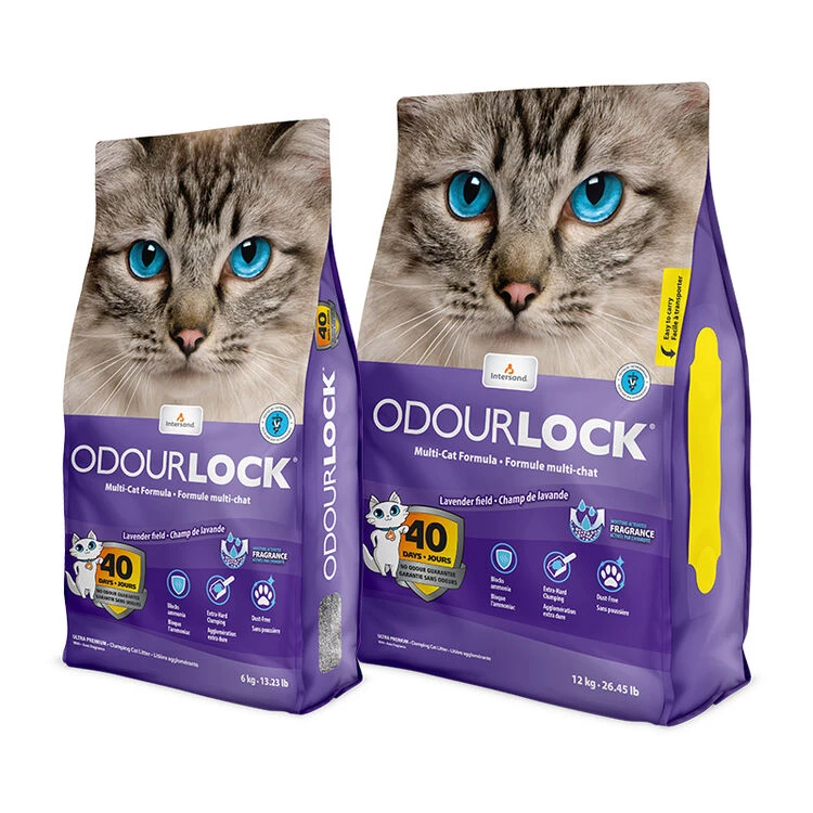This clumping cat litter is made from all-natural clay. Its patented “Smart Odour Shield” technology blocks ammonia release, uniquely neutralising urine and faeces odours for 40 days. This ultra-fast clumping and easy scooping litter makes litter box cleaning so effortless. OdourLock generates less waste than competing clay litters: you’ll use 45% less litter per year. Plus, it’s 99.9% dust-free, leaving no tracking on floors or furniture and keeping your cat’s and your family’s respiratory systems safe. It is soft and comfortable for your cat. It is easily carried thanks to its side handle and is manufactured in Quebec.