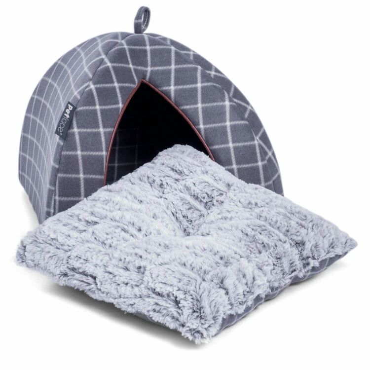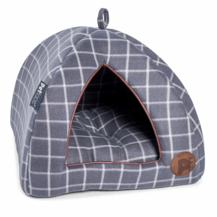 This Petface soft and cosy cat igloo bed will help your pet to relax and sleep comfortably by keeping them warm and giving a feeling of security. Where and how your cat sleeps can make a big difference to their overall comfort and health, so this igloo bed should be located away from outside doors and draughts. The igloos have a grey window pane check design throughout with a super soft faux fur and fleece cushion inside. Available in grey colour.
