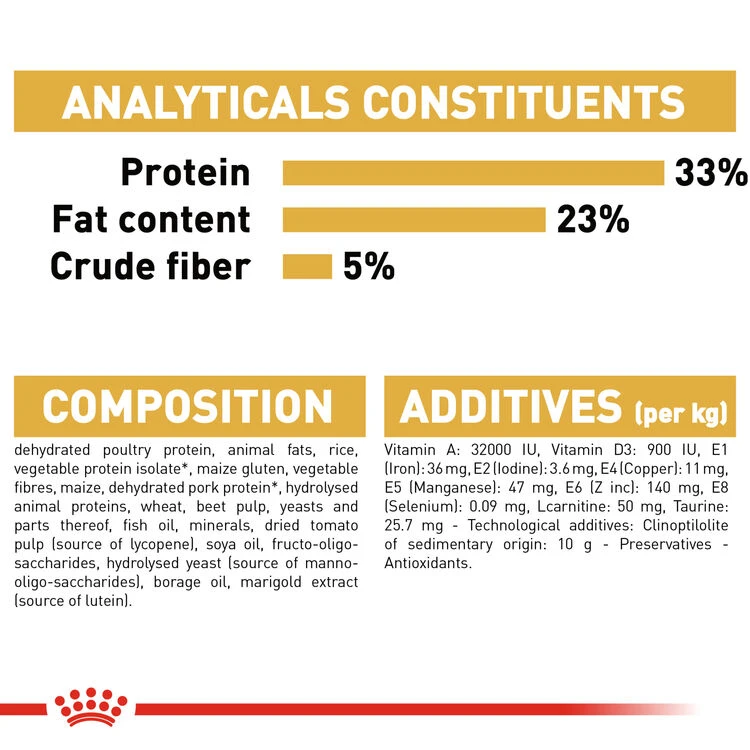 Ingredients: Dehydrated poultry protein, animal fats, rice, vegetable protein isolate*, maize gluten, vegetable fibres, maize, dehydrated pork protein*, hydrolysed animal proteins, wheat, beet pulp, yeasts and parts thereof, fish oil, minerals, dried tomato pulp (source of lycopene), soya oil, fructo-oligo-saccharides, hydrolysed yeast (source of manno-oligo-saccharides), borage oil, marigold extract (source of lutein). *L.I.P.: protein selected for its very high digestibility.